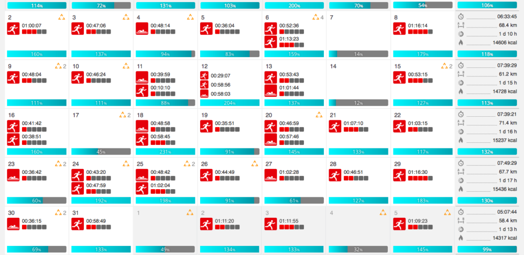 Do tego trzeba dołożyć pływanie, którego nie ma jeszcze dużo, ale z każdym kolejnym tygodniem dodaje metrów. Pływałam średnio 2-3 razy w tygodniu (sama, z trenerem 1:1, w grupie).